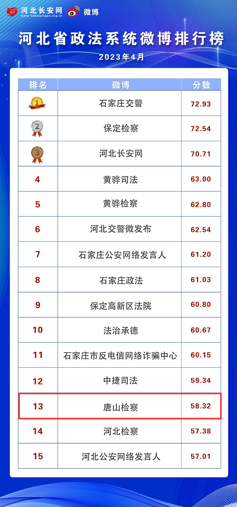 为进一步激发全省政法新媒体账号活力,提高宣传舆论传播力、引导力、影响力、公信力,省委政法委新媒体中心与网络平台合作,开展河北“网络之星”政法新媒体推选活动,逐月发布微博、今日头条、抖音等榜单,年底推选出河北“网络之星”政法新媒体各榜单十佳账号。